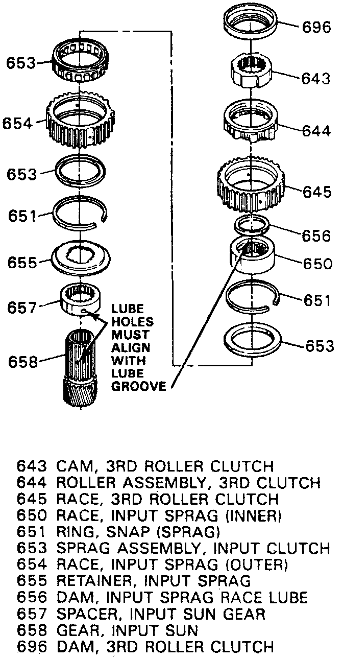 43. Remove 3rd roller clutch and input sprag from input sun gear, then the input sun gear spacer and retainer from sun gear.