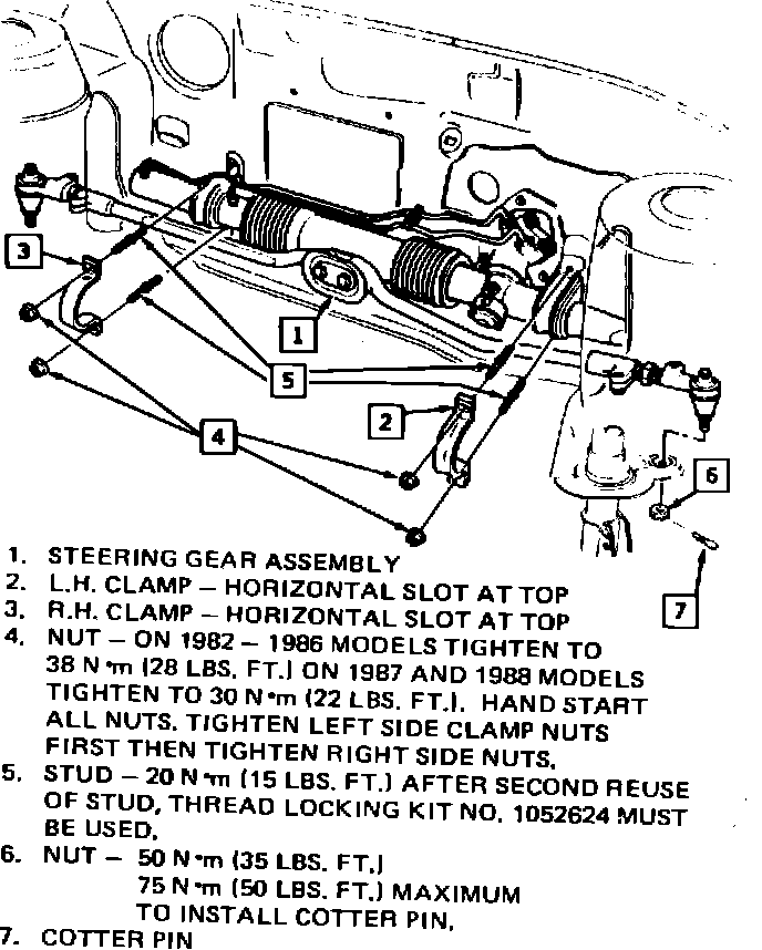 When reinstalling a center-take-off rack and pinion steering gear in a 1982-1988 Sunbird and 1986-1988 Grand Am vehicles, always hand start the four clamp nuts then tighten the left side clamp nuts (driver's side of car) to the correct torque specifications first.. Refer to Figure 1.