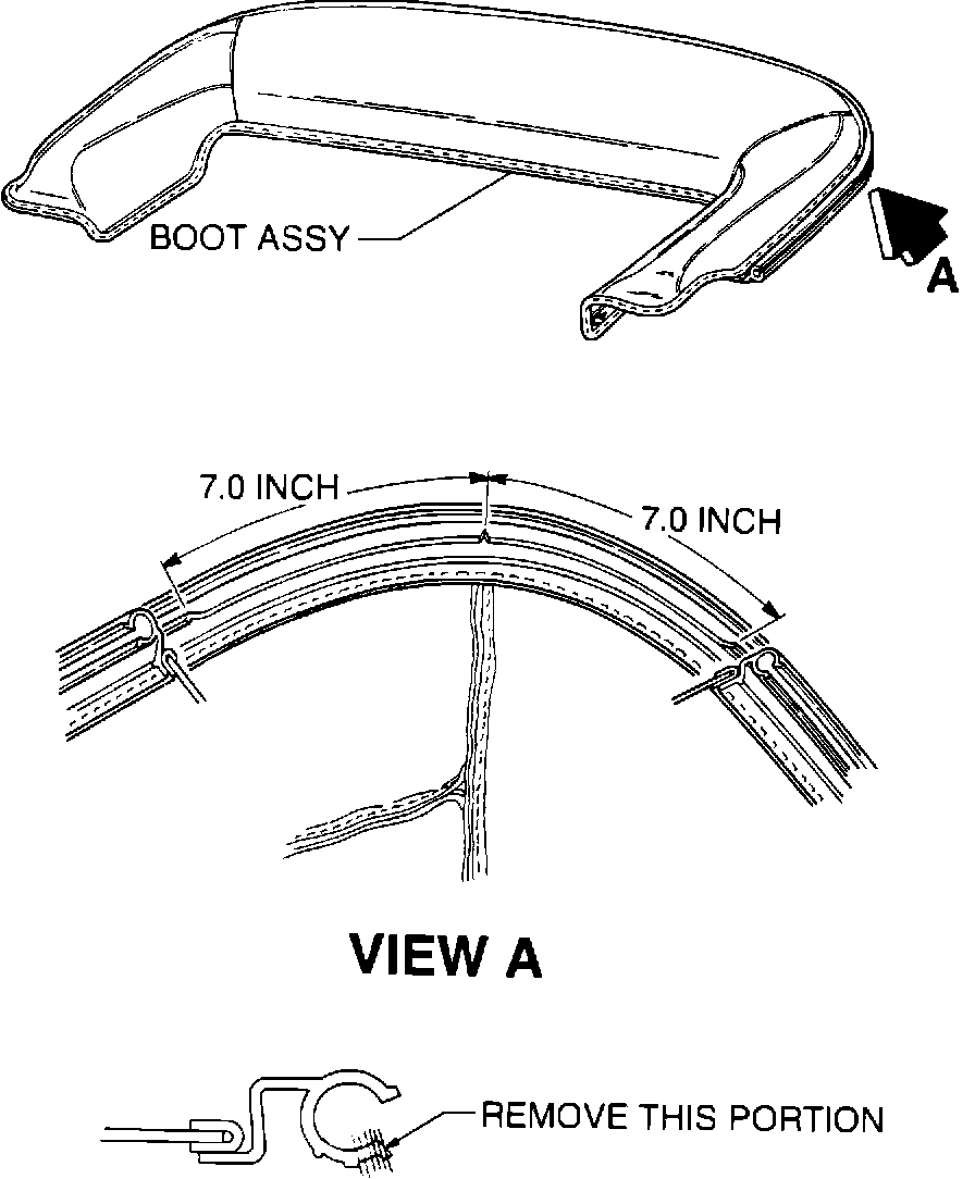 2. Check the retention of the boot rubber retainer to the molding at the rear outboard corners. If the retention of the boot retainer to the molding is unsatisfactory, or if rubber retainer does not retain to the molding, the boot rubber retainer may be modified as follows: