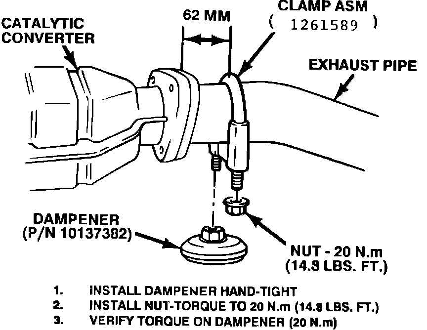 4. Install one nut on the other side of the clamp and torque it to 20 N-m (14.8 lbs.ft.). Check the torque of the dampener to make sure that it is at least 20 N-m (14.8 lbs.ft.). Do not over-torque the dampener or the clamp nut, or the exhaust pipe may be crushed.