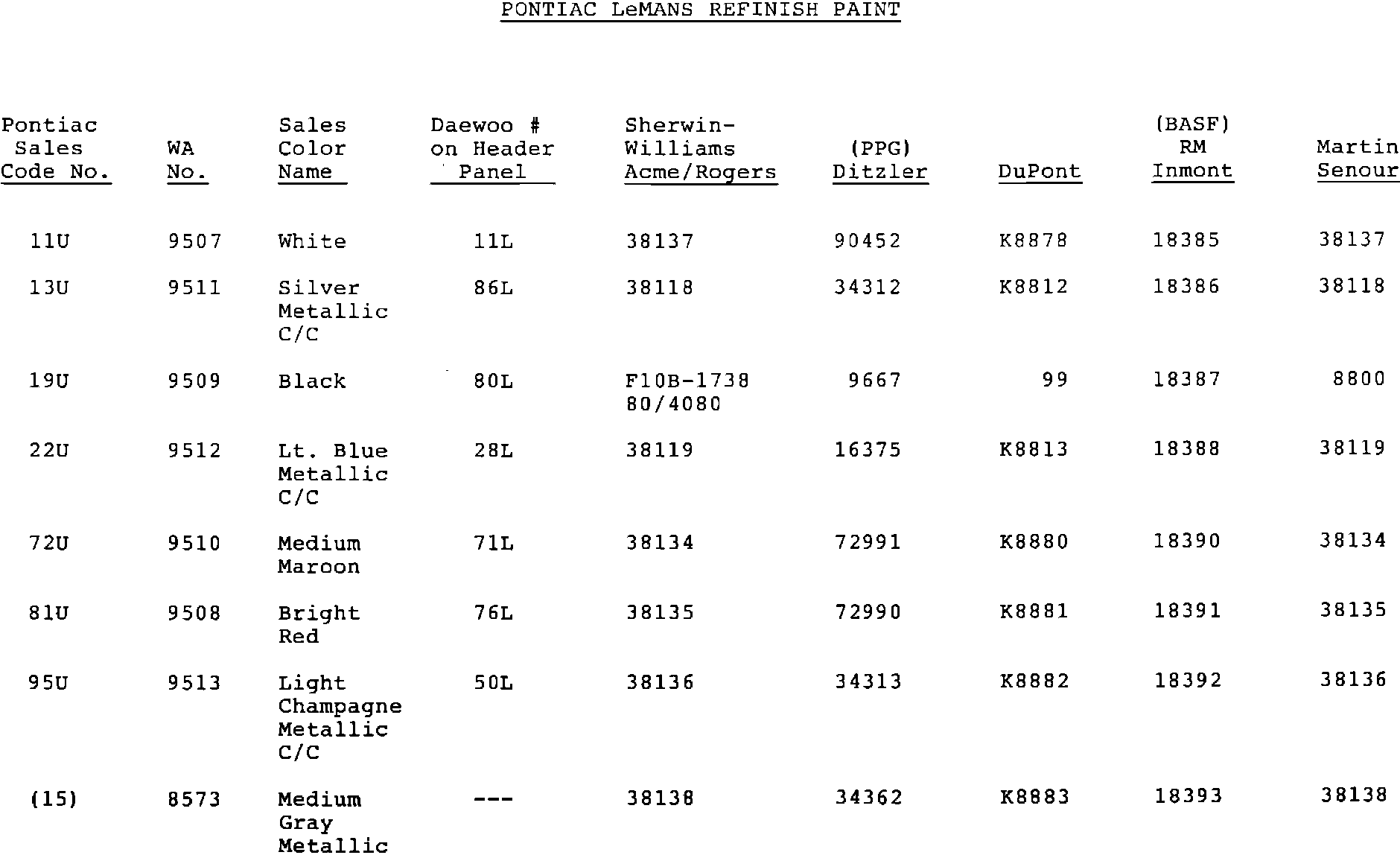 The LeMans assembly plant uses PPG (Ditzler) Paint Systems, and will be painting vehicles with basecoat/clearcoat and conventional enamels. Metalic colors employ a basecoat/clearcoat system and are designated "Metalic C/C" on the chart. All other colors are enamel and do not have a clearcoat applied.