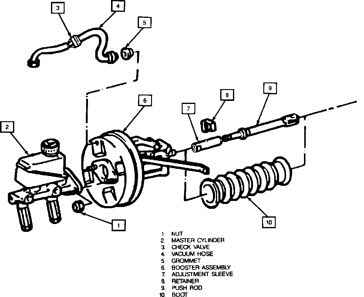 1. Unfasten master cylinder from brake booster and move forward, leaving brake lines attached.2. Remove vacuum hose connection nut from intake manifold.