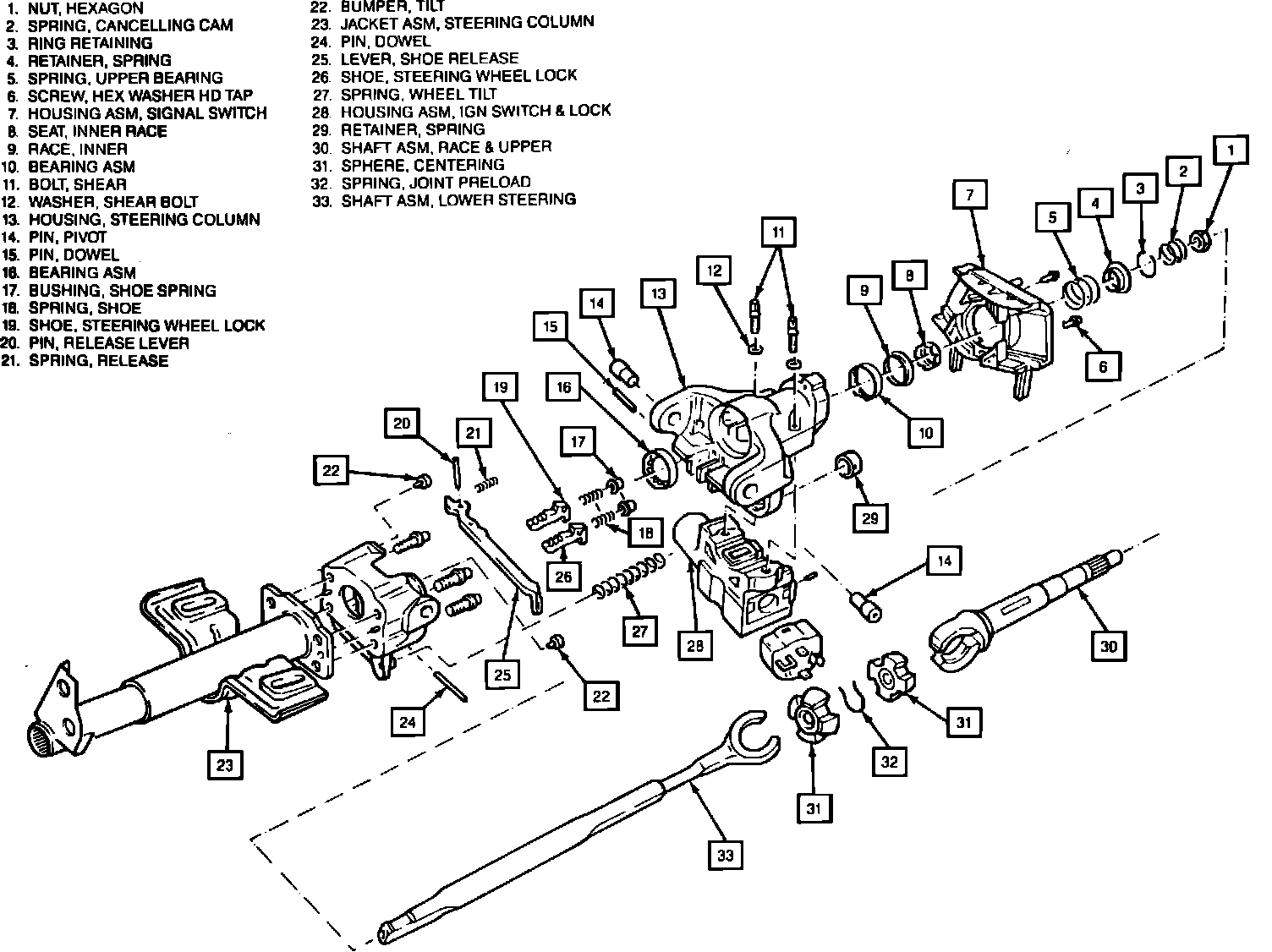 Fig. 1 Exploded view of tilt steering column: