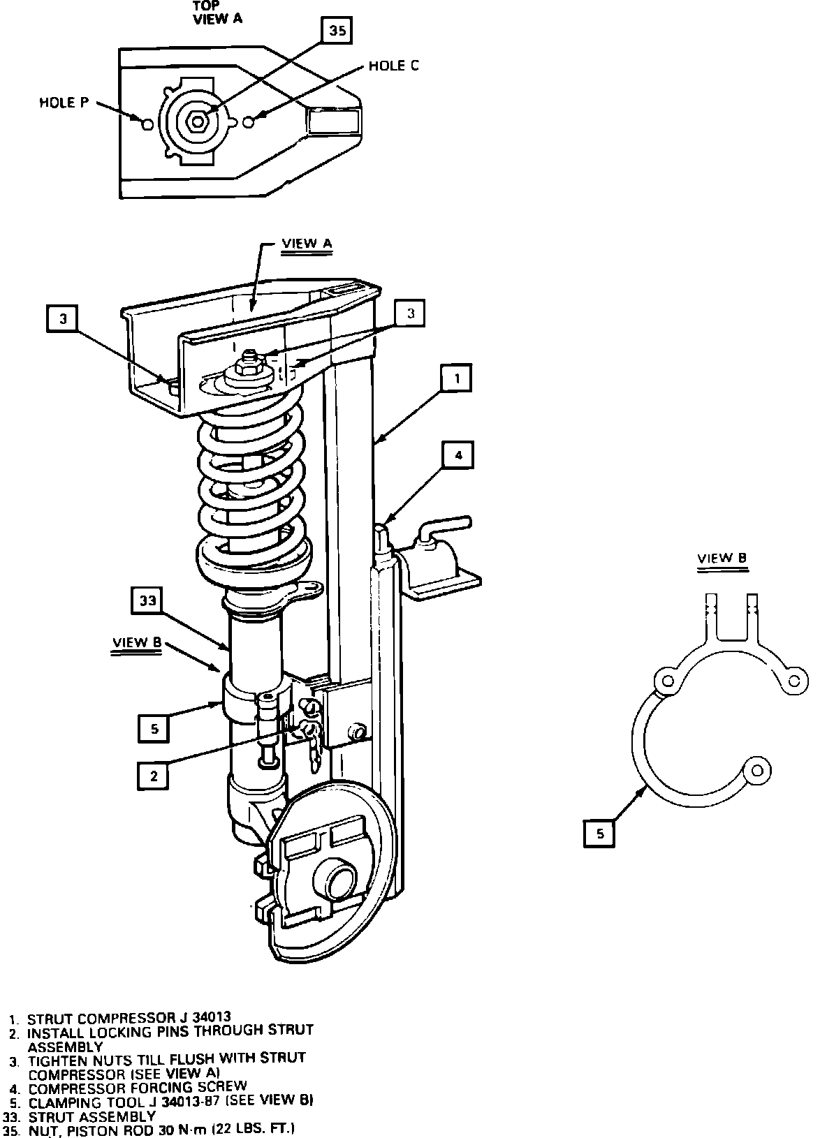 1. Secure strut assembly in compressor tool No. J34013 with adapter J34013-87 or equivalents, Fig. 2.