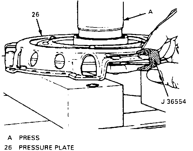 7. Position the new pressure plate in a press. Apply enough pressure on fingers to install the three J-36554 pressure spring clamps at equal points around the pressure plate.