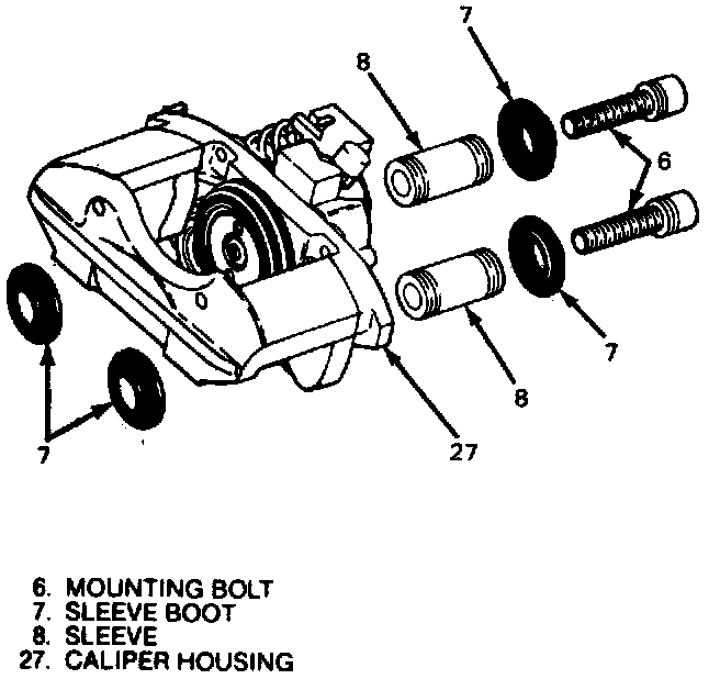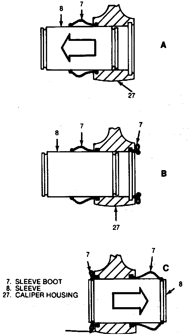 2. Install sleeves (8) and boots (7) in caliper, then caliper over brake rotor into mounting bracket.