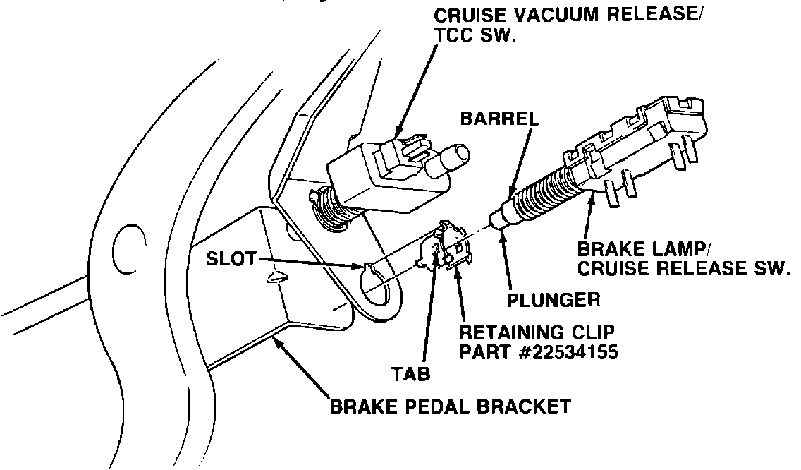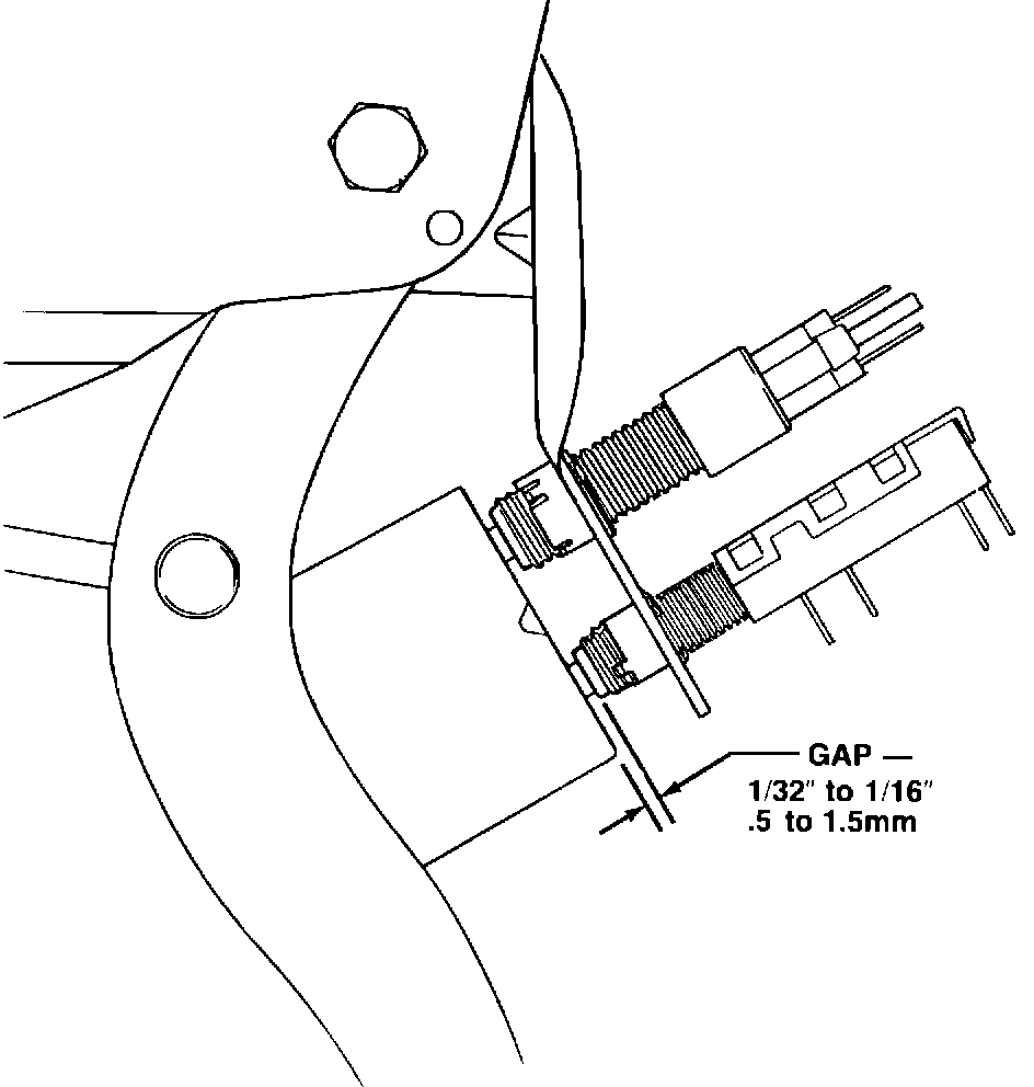 4. Adjust the switch position to obtain 1/32" - 1/16" gap between the brake pedal bracket and the barrel of the brake light/cruise switches WITHOUT BENDING the switch mounting bracket (see Figure 2).