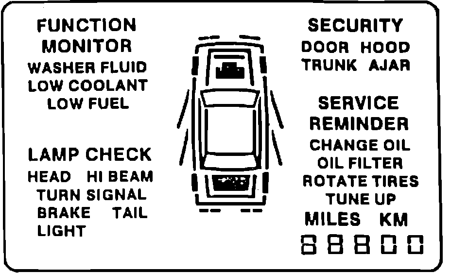 4. Service Reminder--Oil change, oil filter change, engine tune-up and tire rotation intervals are monitored.