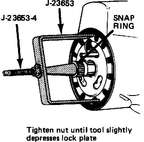 4. Using lock plate compressing No. J-23653 or equivalent, compress lock plate, and pry snap ring from groove on shaft, Fig. 5. Slowly release lock plate compressing tool, then remove tool and lock plate from shaft end.