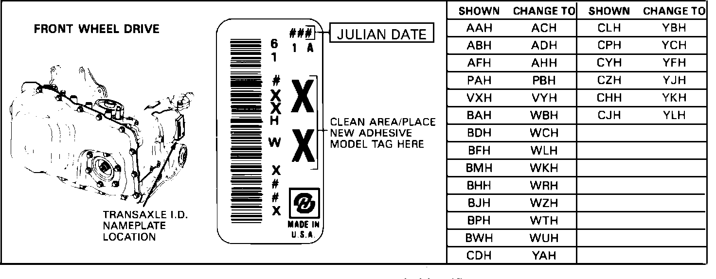 B) If built before Julian Date (076) and the I.D. tag has the previous model codes shown in figure 1, order 8662954 for 3rd clutch plates and 8662960 for overhaul packages. If these packages are not available, then order the package listed in 1A and the calibration update kit package listed under "Service Parts Information" for the transaxle model. Go to step 2.
