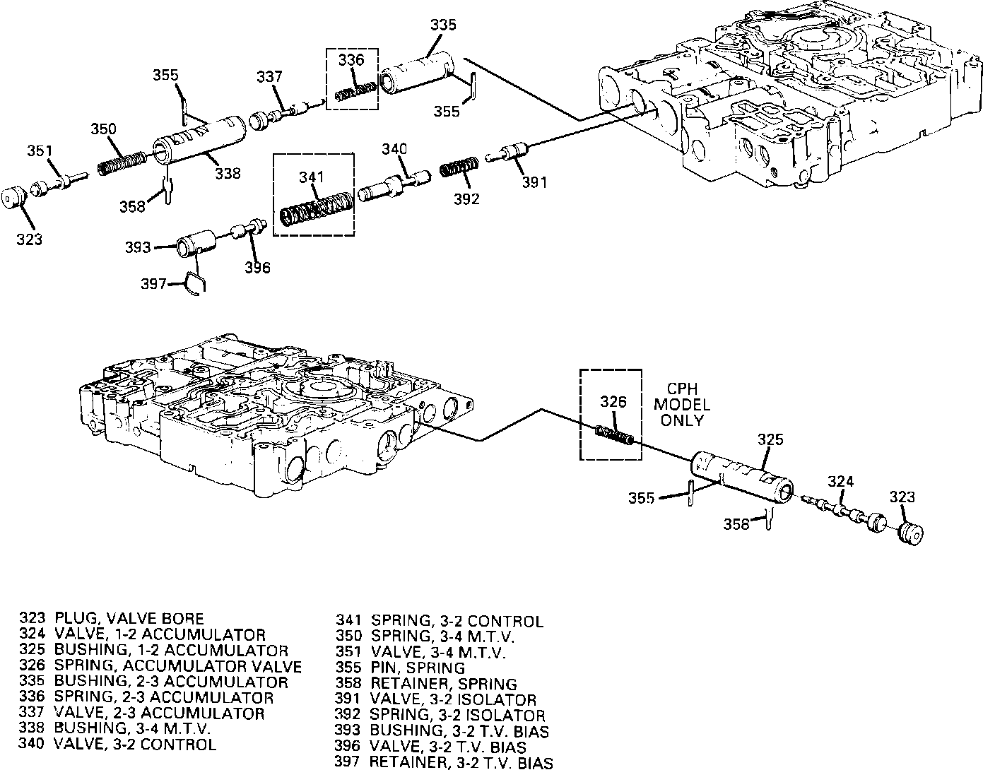 - 1-2 accumulator valve spring (326) (CPH model only) (Figure 2)