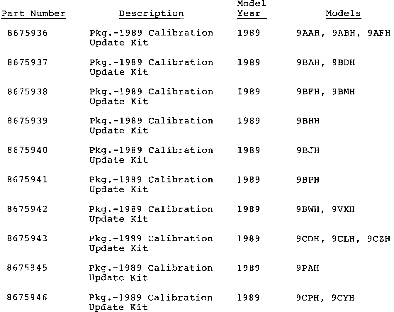 IMPORTANT: The 1989 calibration update kit package must be used with 8662990 for 3rd clutch plates and 8662989 for overhaul packages.