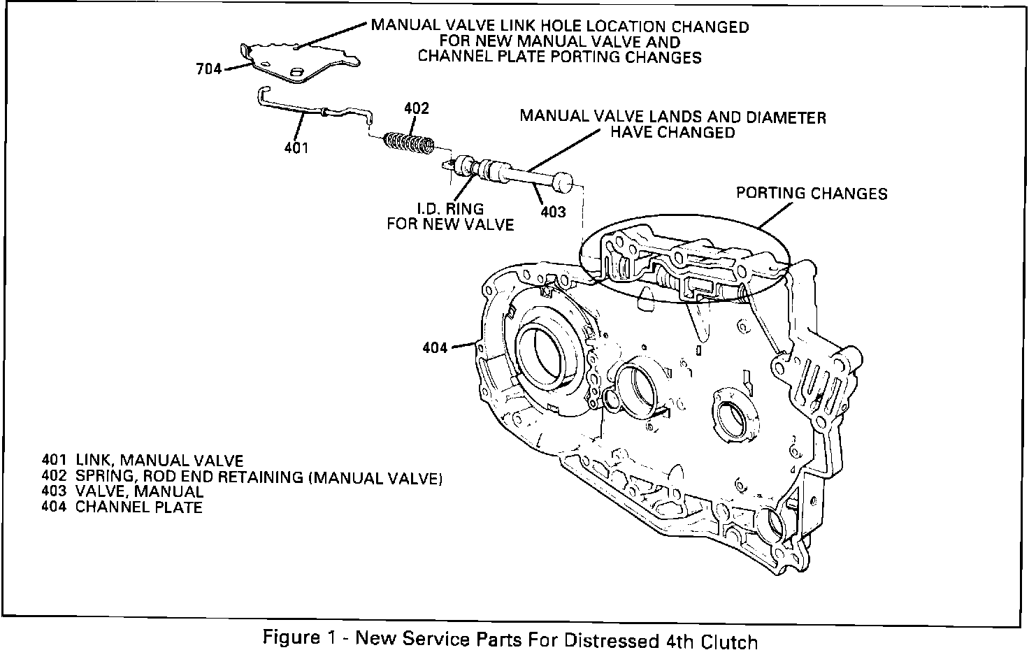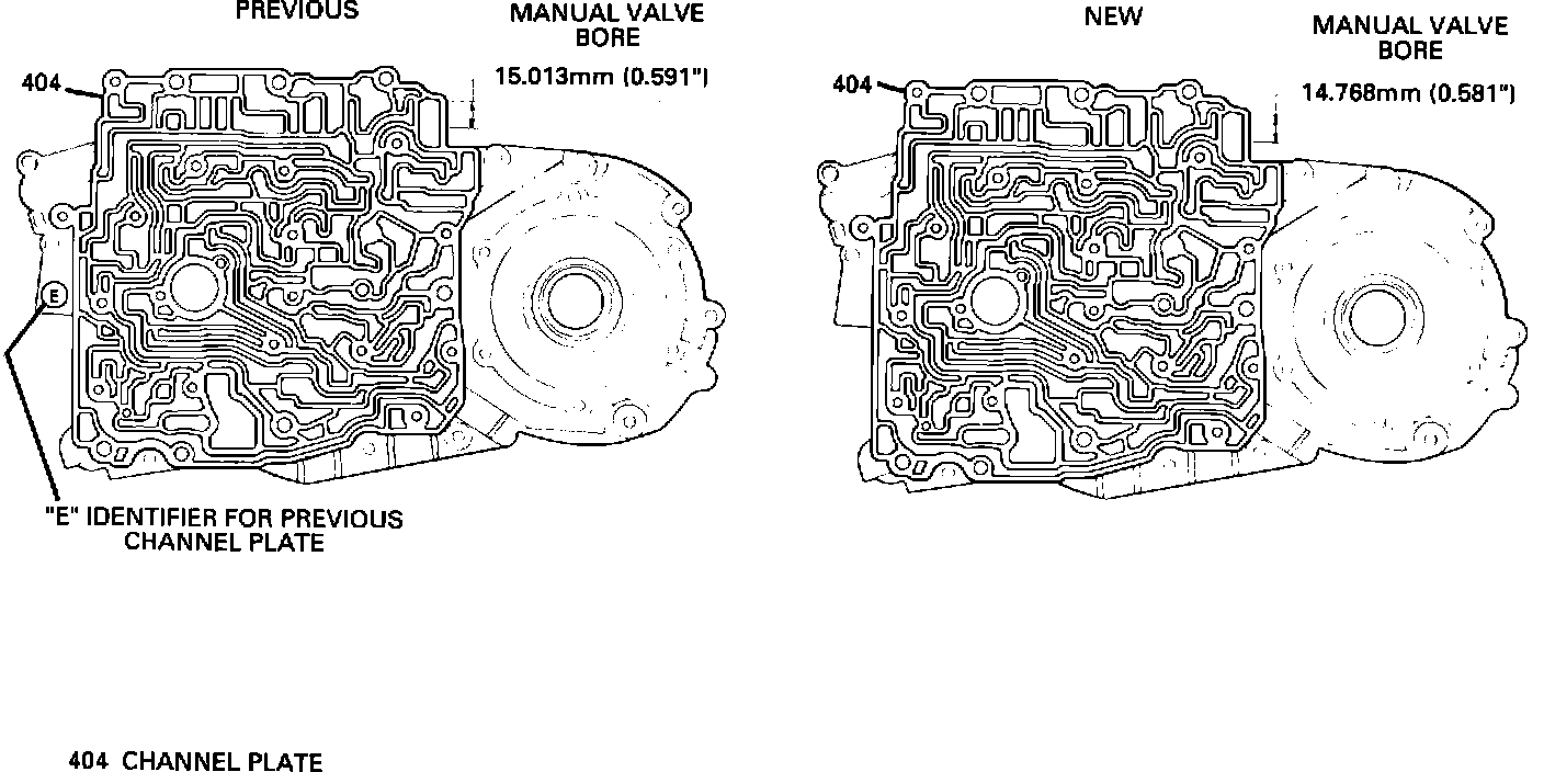 - New channel plate (404) will have porting changes for the new manual valve and new inside detent lever. The porting changes will help ensure that two ports will never be opened at once to cause distress to the 4th clutch assembly when the shift cable is not set correctly or is kinked or binding. The bore for the new manual valve will be reduced to accommodate the manual valve. This will make the new and previous parts non-interchangeable. The new manual valve and inside detent lever must be used with the new service channel plate. Only the new service channel plate will be available for 1985-1/2 through 1990 models.