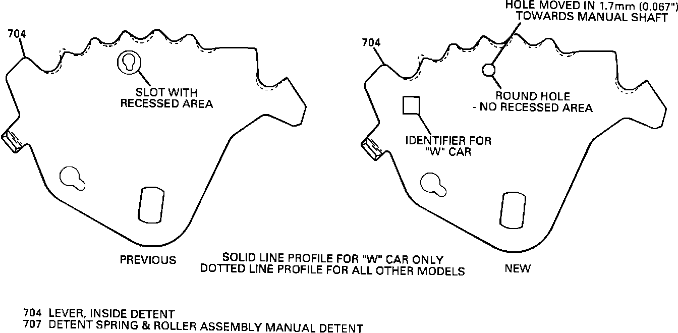 The previous and new inside detent lever are not interchangeable even though the parts will physically assemble. The new inside detent lever must be used with the new manual valve and channel plate. The previous inside detent lever must be used with the previous manual valve and channel plate. The identifier for the new Grand Prix inside detent lever is an added square hole. The previous Grand Prix inside detent lever is gold in color. Some of the early new Grand Prix inside detent levers may be gold in color and have the added square hole. The gold color will be discontinued and the square hole will be the only identifier for the new Grand Prix inside detent lever. The previous inside detent lever will still be available for models that just need replacement of the lever for 1987 and prior model years.