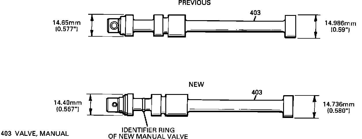 - New manual valve (403) will have changes to the valve lands and be reduced 0.25 mm (0.010") in diameter for the new porting changes to the service channel plate. The previous and new manual valves are not interchangeable. The new manual valve will assemble into the previous channel plate but the transaxle will not function because of excessive leakage due to the differences in sizes.