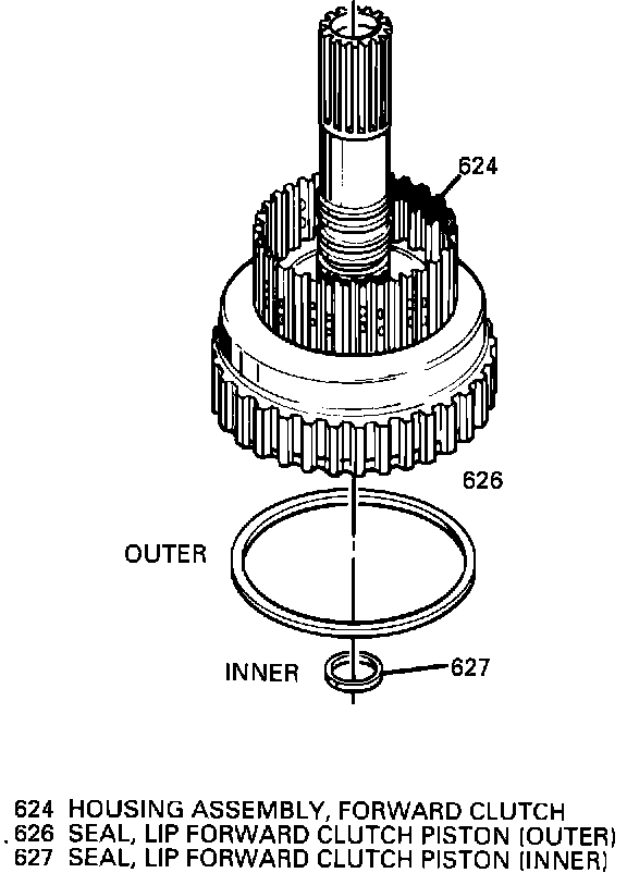 New Forward clutch Piston seals (626, 627) made of Viton. These new Viton seals replace the currently used lip seals which may become brittle and take a permanent heat set (become flat) with high mileage, allowing possible leaks in the forward clutch (624). Refer To Figure 1.
