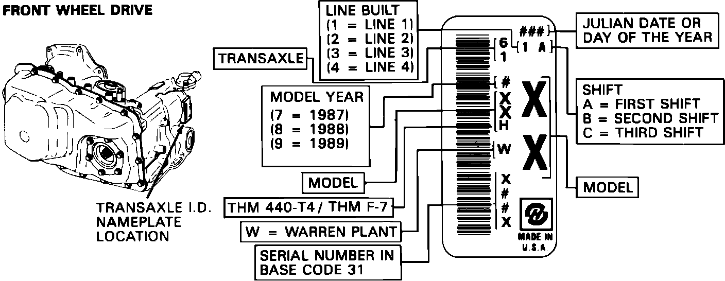 FIGURE 1 - THM 440-T4/THM F-7 TRANSAXLE IDENTIFICATION INFORMATION: