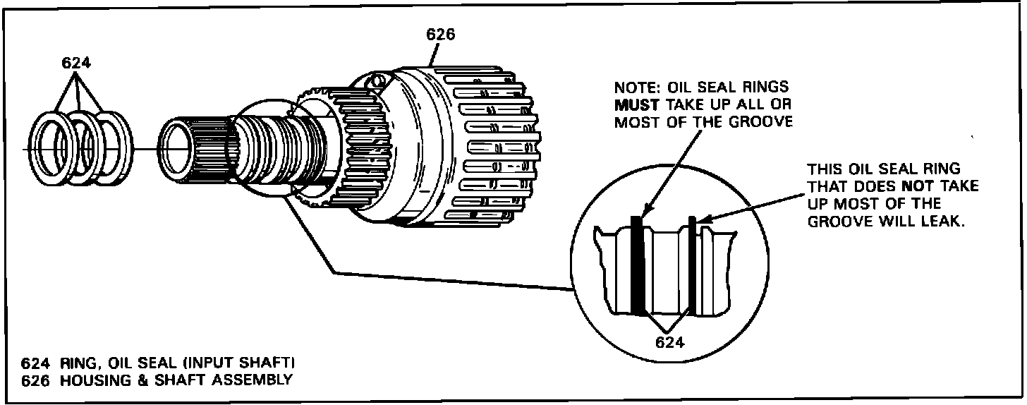 Disassemble the transaxle, remove the Shaft and Housing Assembly (626) and inspect the Input Shaft Oil Seal Rings (624) while in the grooves. The rings should take up most of the groove width. If the ring (s) only takes up about half of the groove width then replace them with rings from the package listed under Service Parts Information. Follow procedures outlined in the 1989 Service Manual Unit Repair Section.