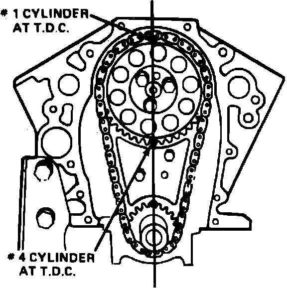 9. Install chain on camshaft sprocket. Hold sprocket vertical with chain hanging below and shift around to align the timing marks on sprockets.