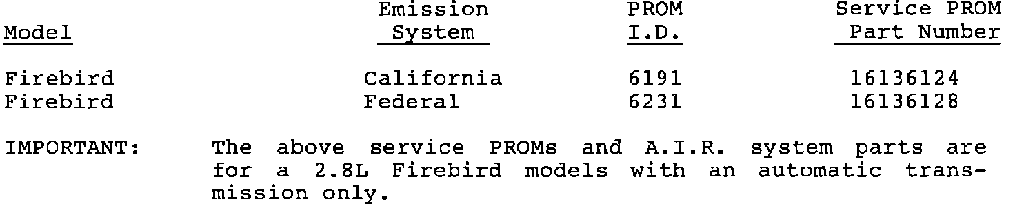 IMPORTANT: Reference the chart below for 1987-88 2.8L Firebirds with four-speed automatic transmission, service PROM part numbers: