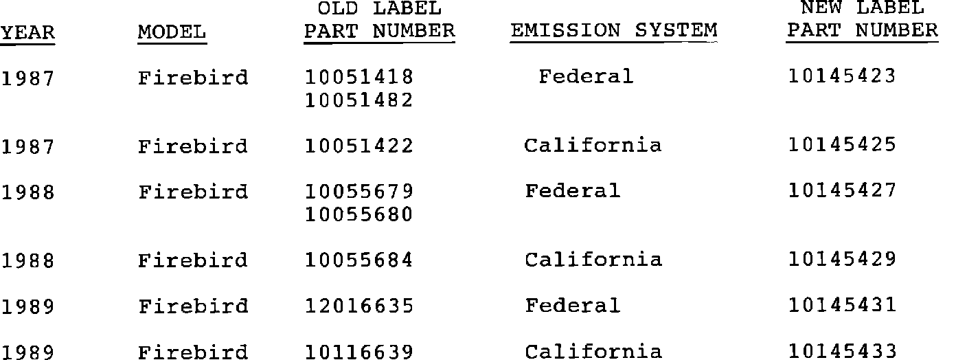 After installation of the A.I.R. service kit has been completed, a new vehicle emission control label should be installed on the vehicle. Reference the chart below for the proper emission label part number.