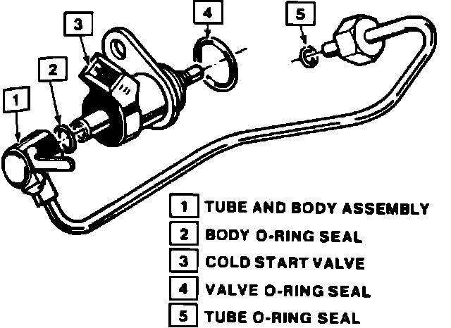9. Remove the O-ring seals from the tube and body assembly and cold start valve, discard the seals.