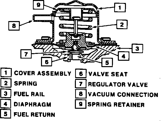 The function of the regulator is to maintain a constant pressure differential across the injectors at all times. The pressure regulator compensates for engine load by increasing fuel pressure as engine vacuum drops. The pressure regulator is mounted on the fuel rail, and is serviced as a complete assembly.