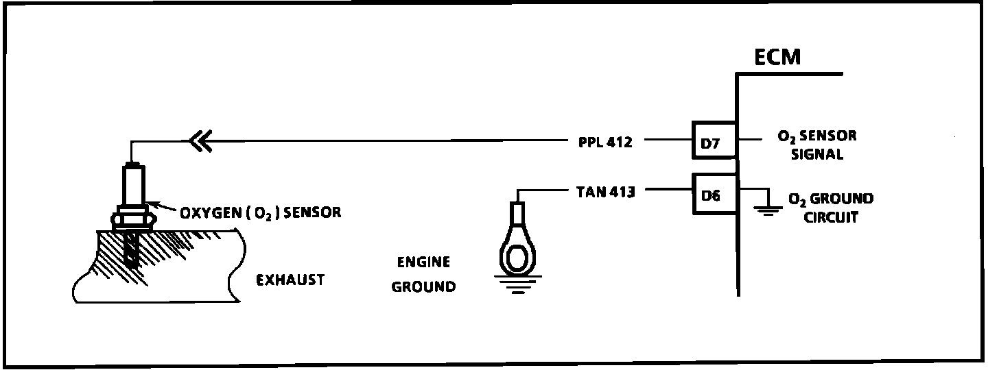 The Electronic Control Module (ECM) supplies a voltage of about 0.45 volt between terminals "D6" and "D7". (If measured with a 10 megohm digital voltmeter, this may read as low as 0.32 volt.) The 02 sensor varies the voltage within a range of about 1 volt if the exhaust is rich, down through about 0.10 volt if exhaust is lean. The sensor is like an open circuit and produces no voltage when it is below 360~C (600~F.). An open sensor circuit or cold sensor causes open loop operation.