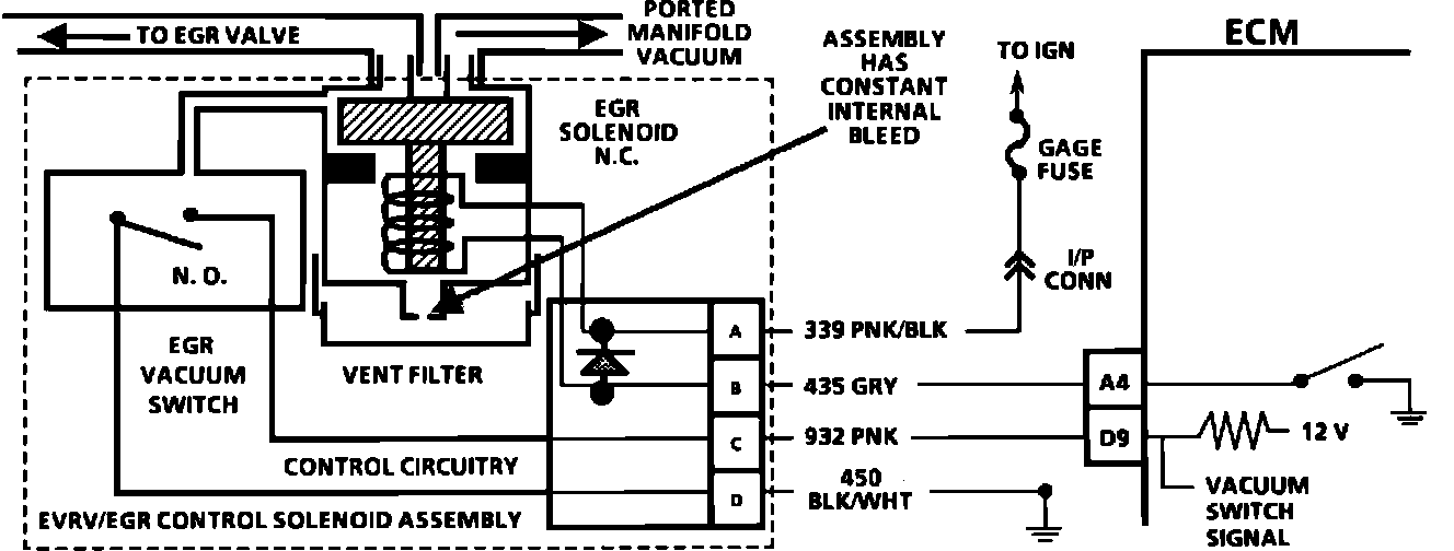 The Exhaust Gas Recirculation (EGR) valve is opened by ported manifold vacuum. In order to control and monitor EGR application an Electrtonic Vacuum Regulator Valve (EVRV) is used. The EVRV is composed of two devices: