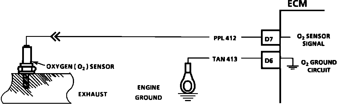 The Electronic Control Module (ECM) supplies a voltage of about 0.45 volt between terminals "D6" and "D7". (If measured with a 10 megohm digital voltmeter, this may read as low as 0.32 volt), The 02 sensor varies the voltage within a range of about 1 volt if the exhaust is rich, down through about 0.10 volt if exhaust is lean. The sensor is like an open circuit and produces no voltage when it is below about 316~C (600~F.) An open sensor circuit or cold sensor causes "Open Loop" operation.