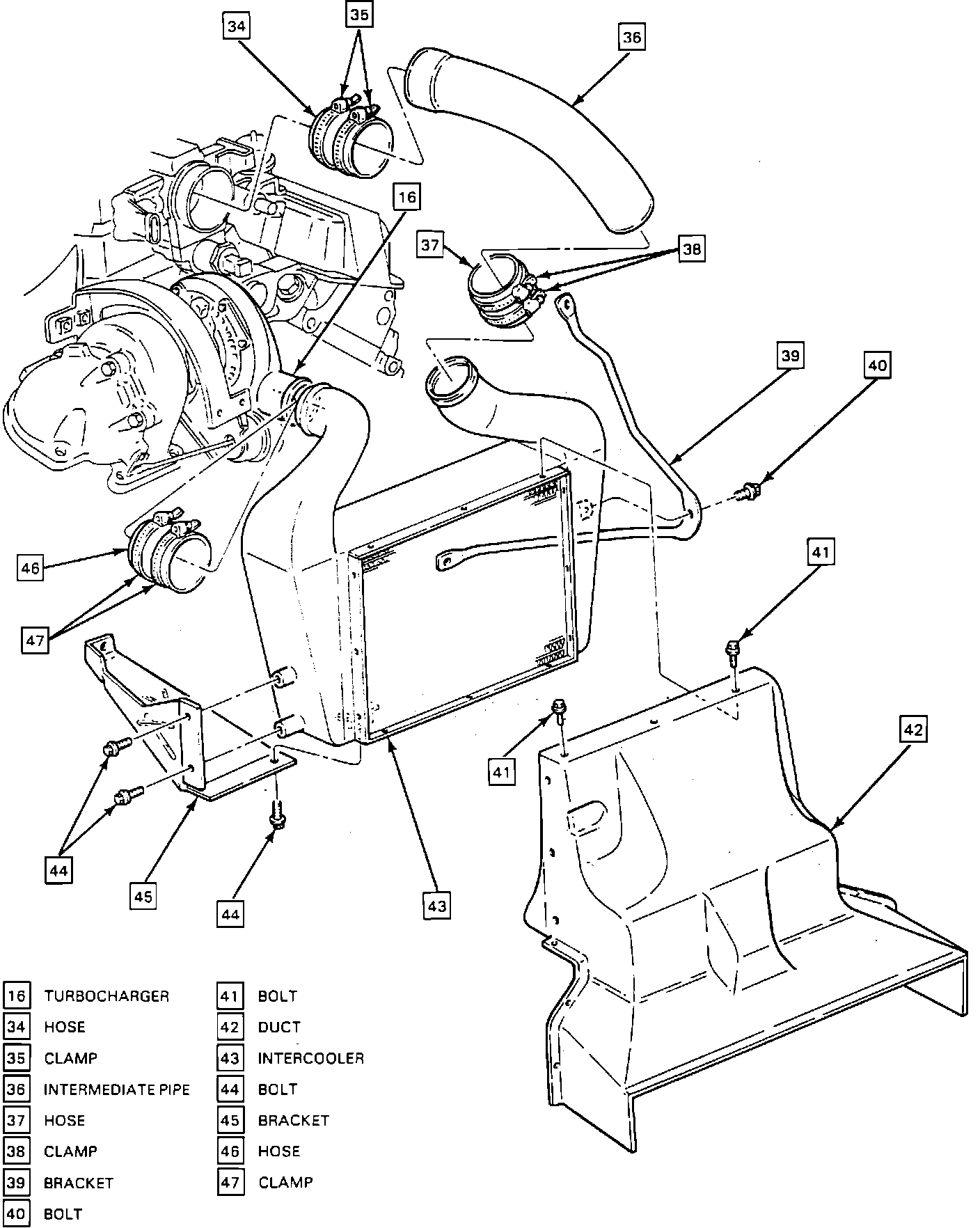 4. Remove bolts (41) retaining duct (42) to the bottom of the intercooler (43).