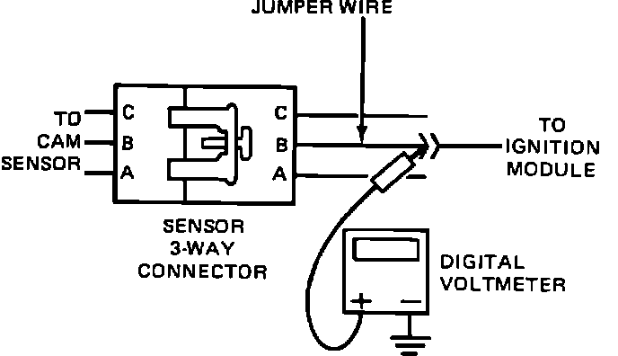 7. Turn ignition "ON," then rotate sensor counterclockwise until sensor switch closes. This is indicated by voltage reading going from a high of 5.0 to 12.0 volts to a low of 0 to 2.0 volts.