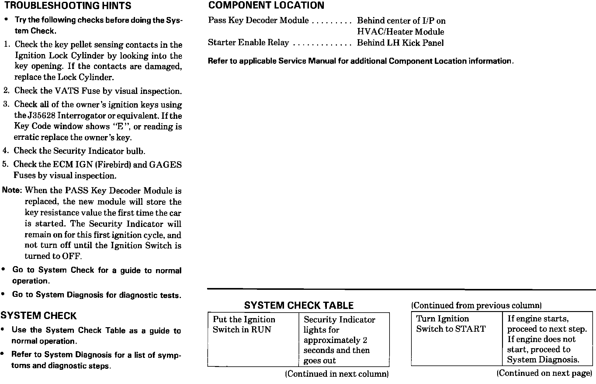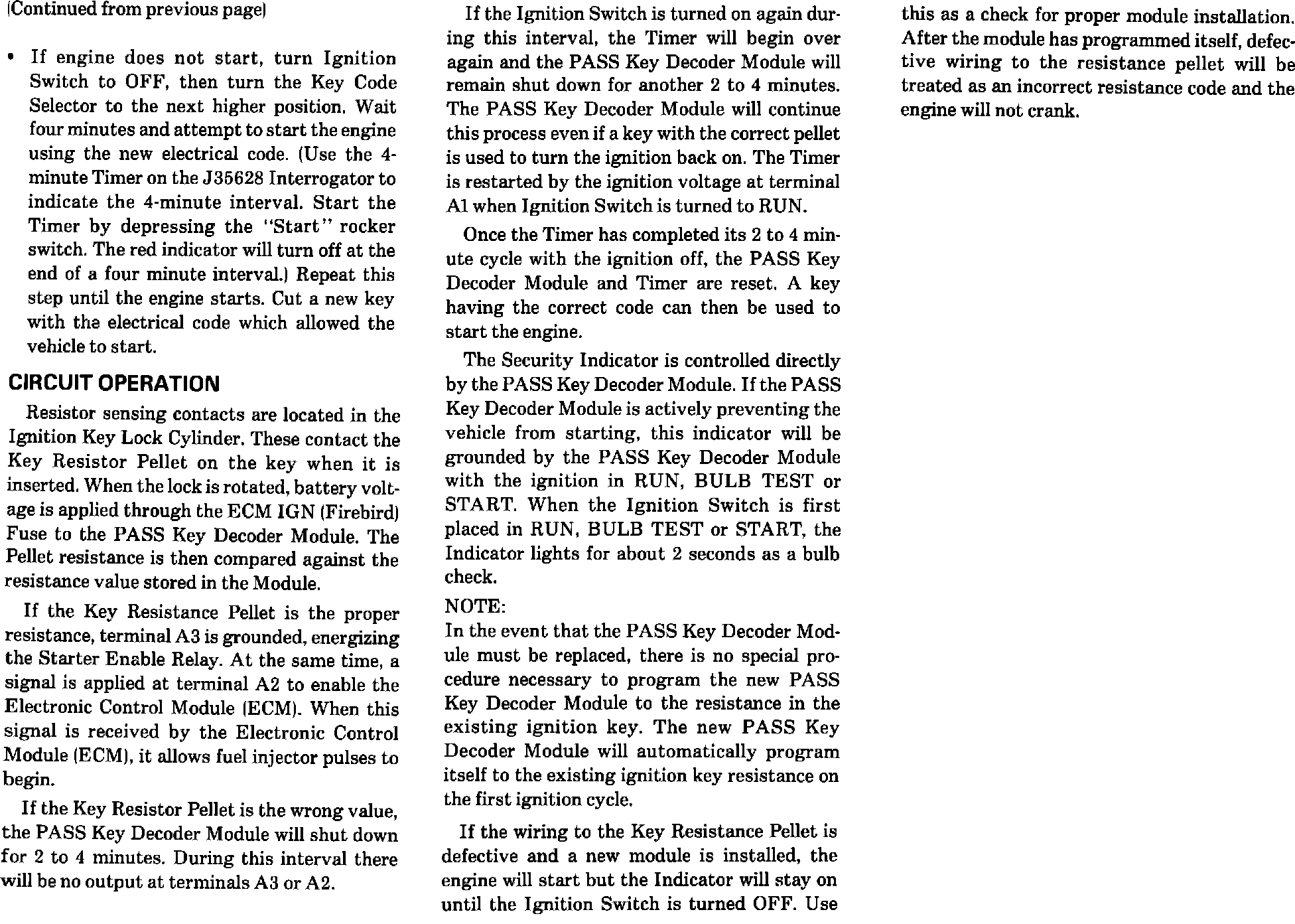 An analysis of field service activities has shown that the Pass Key Decoder Module is usually not the cause of customer concerns relative to Pass Key performance. Should a comment be made, components more likely to be responsible for the condition are (listed in descending order): lock cylinder and steering column wiring, ignition keys, wiring and the starter enable relay.