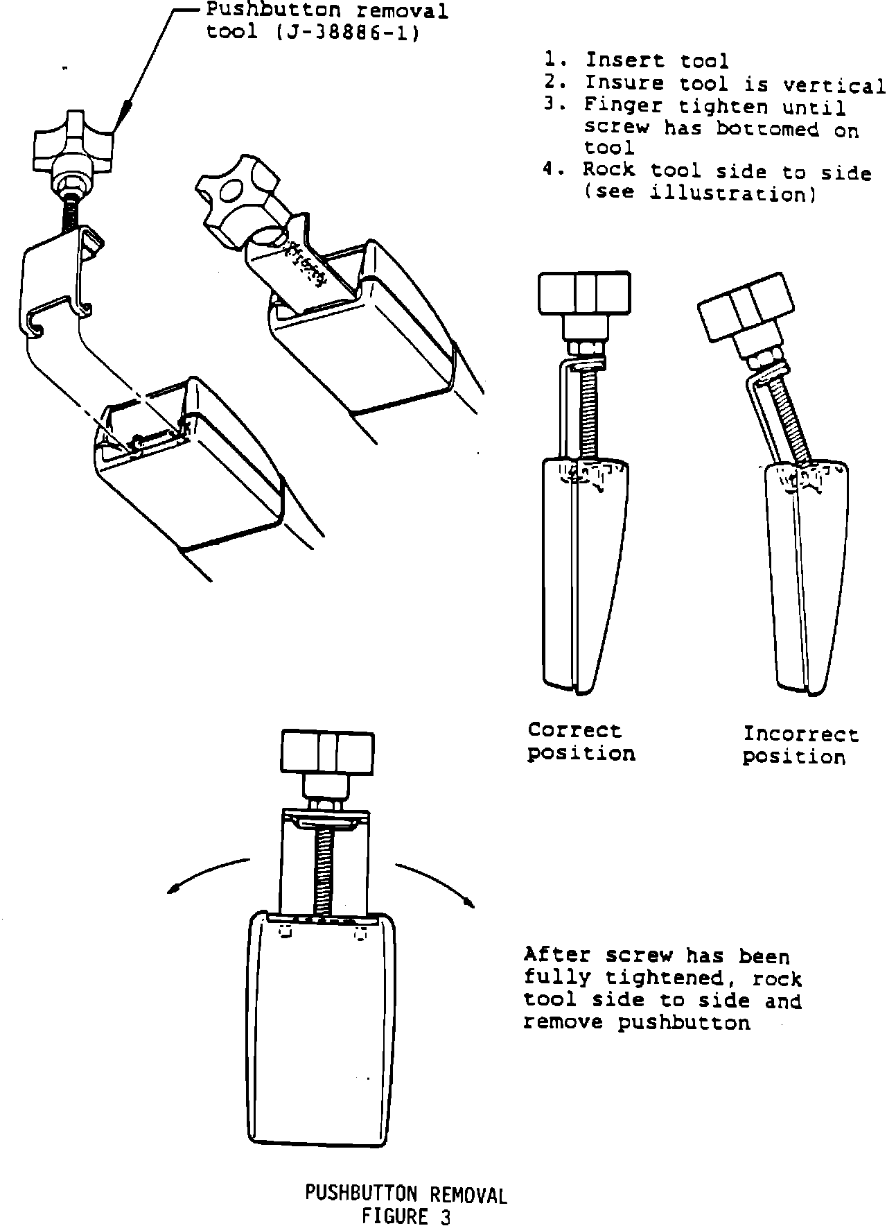 2. Remove pushbutton by inserting pushbutton removal tool (J-38886-1) under the edge of the pushbutton in a horizontal position and then rotate tool to a vertical position. See Figure 3 on the next page.