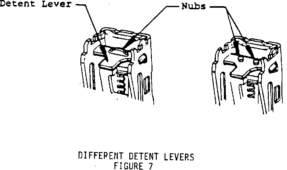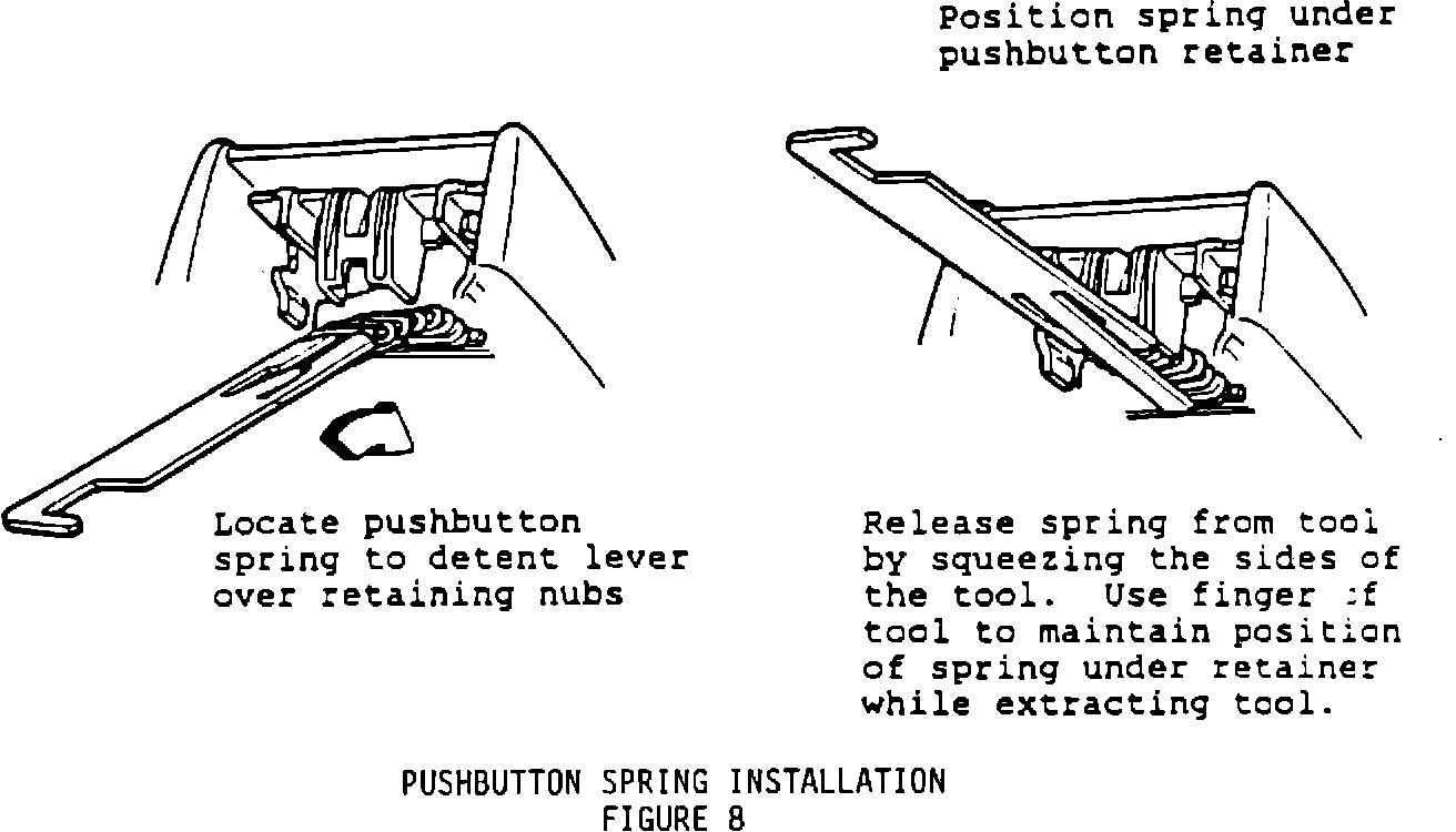 Install the pushbutton spring on the detent lever. Note that there are two different detent lever designs using either one or two retaining nubs - Figure 7. The pushbutton spring must be positioned over the retaining nub(s) on the detent lever and secured under the pushbutton - Figure 8.