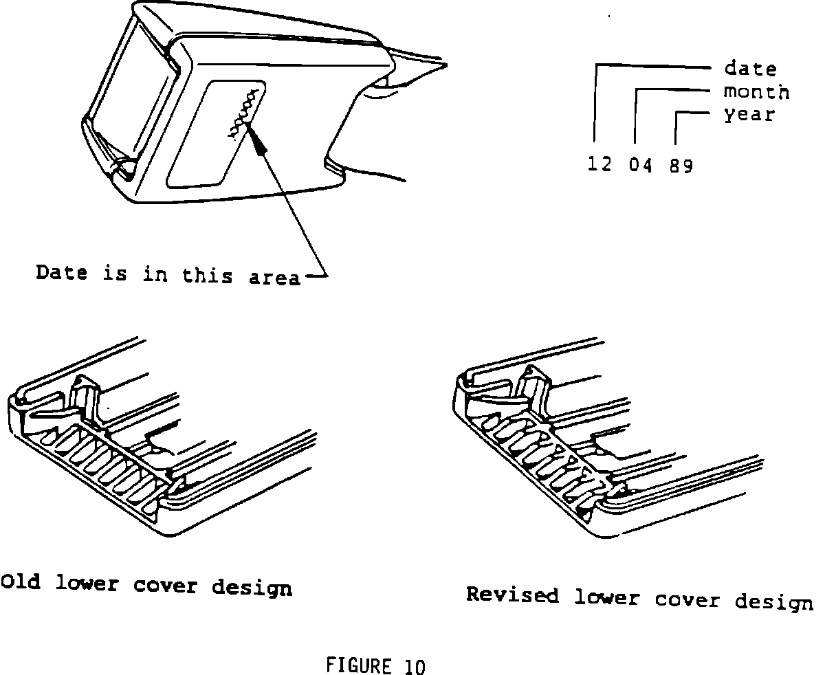 NOTICE: Buckles in some 1989 vehicles and buckles in all 1990 model year vehicles will not require the installation of buckle protectors. To determine if protectors are needed on 1989 vehicle buckles, note the assembly date stamp on the lower cover - Figure 10. If the stamp on the buckle is after 120489 (April 12, 1989), it will not require a protector. These buckles have revised lower cover ramps and do not need an additional protector.
