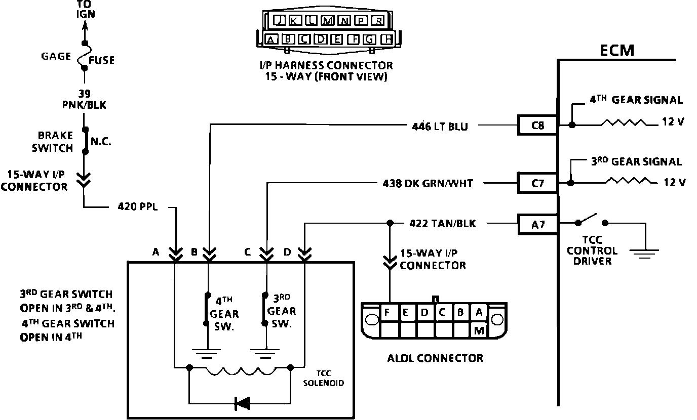 4. Checks for 3rd and 4th gear signal to ECM. These signals will not prevent TCC engagement, but could cause a change in the engage and disengage speed points.