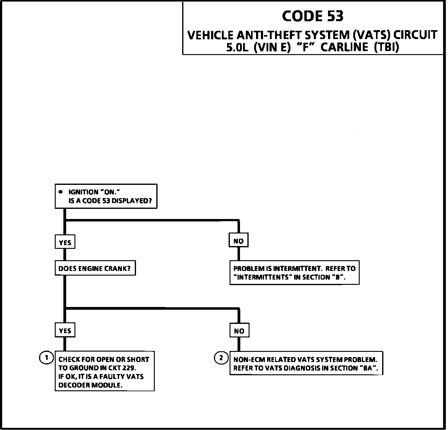 1. If the engine cranks, and a Code 53 is stored, it indicates that the portion of the module which generates the signal to the ECM is not operating or CKT 229 is open or shorted to ground. If the decoder module is found to be OK, as determined from Section "8A", the ECM may be at fault, but this is not a likely condition.