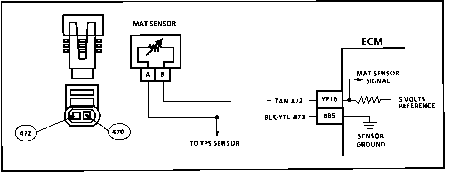 The Manifold Air Temperature (MAT) Sensor uses a thermistor to control the signal voltage to the Electronic Control Module (ECM). The ECM applies a voltage (about 5 volts) on CKT 472 to the sensor. When manifold air is cold the sensor (Thermistor) resistance is high, therefore the ECM will see a high signal voltage. As the air warms, the sensor resistance becomes less, and the voltage drops.