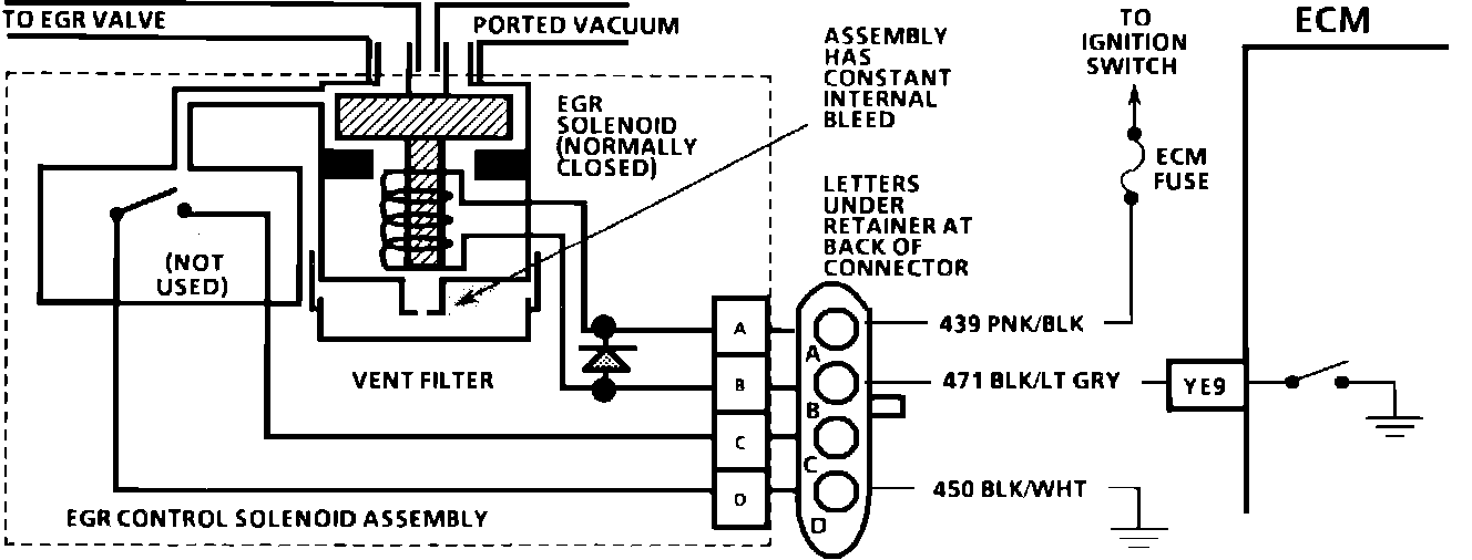The ECM operates the vacuum solenoid to control the Exhaust Gas Recirculation (EGR) Valve. This solenoid is normally closed. By providing a ground path, the ECM energizes the solenoid, allowing vacuum to reach the EGR valve.