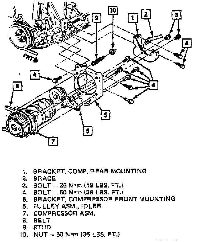 CAUTION: Any repair to the A/C compressor or the A/C belt system will require loosening some A/C bracket bolts. To prevent future torque loss after retightening of these bolts, the bolt or stud should be replaced with an appropriate new bolt or stud OR apply Loctite� 242 or equivalent to the bolt or stud threads. Follow the package instructions for best retention.