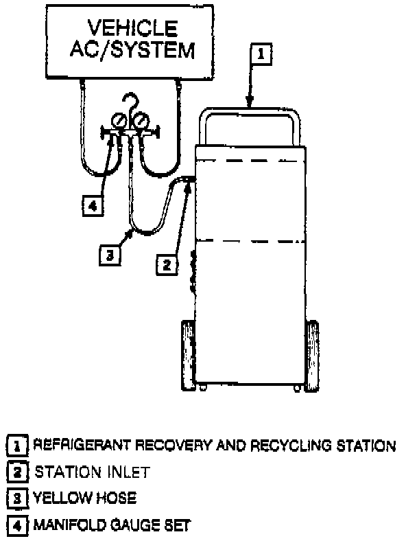 1. Start vehicle and run with the A/C on for 2 minutes then attach a manifold gage set to the A/C system and attach the recovery station inlet hose to the center fitting of the manifold gage set.