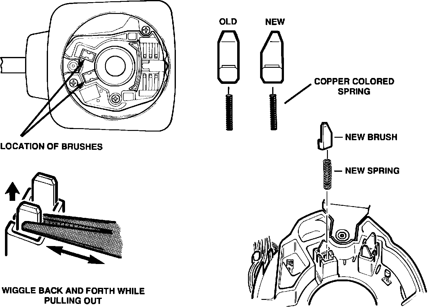 6. Using pliers, remove four brushes and springs by rocking each brush back and forth while pulling it up and out of position. (see Figure 1) Discard springs and brushes.