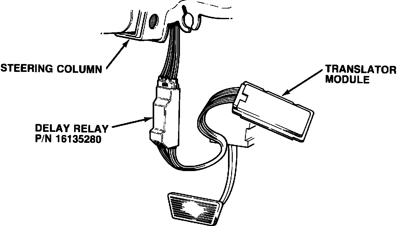 Install a new delay relay, P/N 16135280 between steering column wiring harness and translator module. Module is located on lower right hand side of the steering column. (See Figure 2)