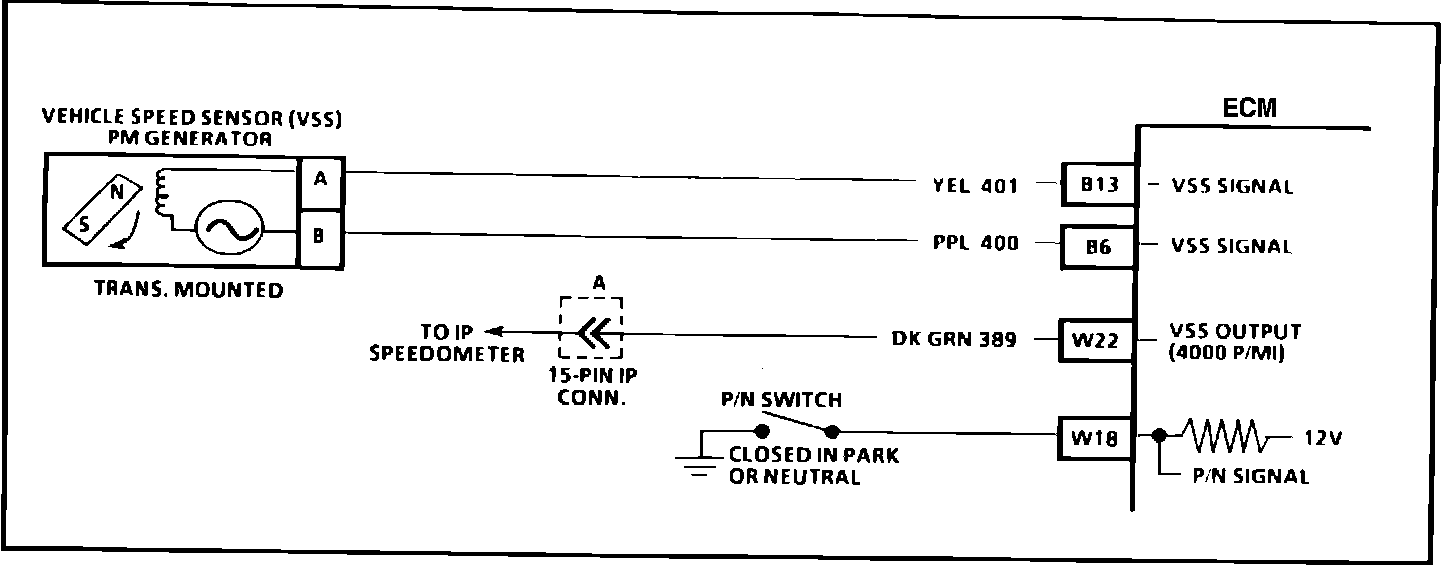 Vehicle speed information is provided to the ECM by the Vehicle Speed Sensor (VSS). It is a Permanent Magnet (PM) generator and is located in the transaxle. The generator produces a pulsing voltage whenever the vehicle speed is over 3.0 mph. The voltage level and number of pulses increase as the vehicle's speed increases. The ECM converts the pulse voltage into miles per hour. This data is used for calculations and can be displayed on the "Scan" tool. The function of the VSS buffer has been incorporated into the ECM. The ECM supplies the signal for the instrument panel, 4000 pulses per mile, for operating the odometer and speedometer.