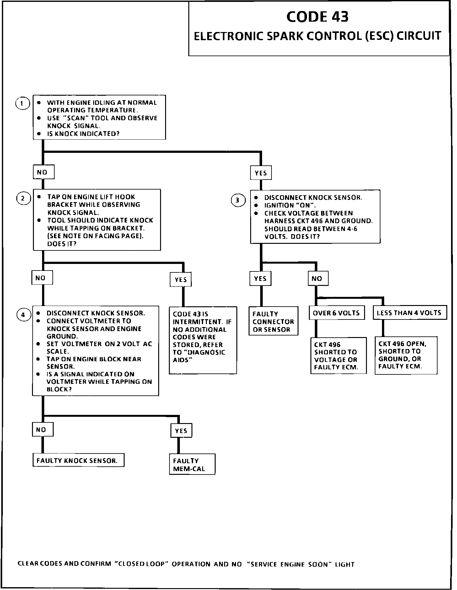 If circuit 496 becomes open or shorted to ground the voltage will either go above 3.5 volts or below 1.5 volts. If either of theses conditions are met for about 5 seconds, a code 43 will be set.