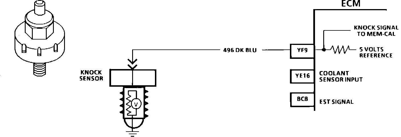 The knock sensor is used to detect engine detonation and the ECM will retard the electronic spark timing based on the signal being received. The circuitry within the knock sensor causes the ECM's supplied 5 volt signal to be pulled down, so that under a no knock condition CKT 496 would measure about 2.5 volts. The knock sensor produces an A/C signal which rides on the 2.5 volts DC voltage. The amplitude and signal frequency is dependent upon the knock level.