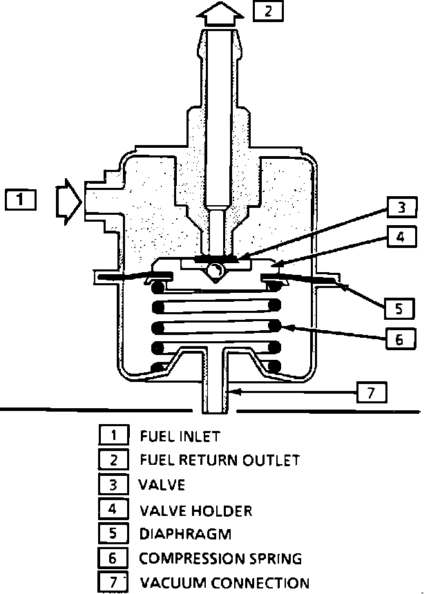 The fuel pressure regulator is a diaphragm-operated relief valve with injector pressure on one side and manifold pressure on the other. The function of the regulator is to maintain a constant pressure at the injectors at all times. The pressure regulator also compensates for engine load by increasing fuel pressure, when it sees low engine vacuum.