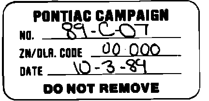 Each vehicle modified in accordance with the instructions outlined in this Product Campaign Bulletin will require a "Campaign Identification Label." Each label provides a space to include the campaign number, the five digit dealer code of the dealer performing the campaign service, and the date the vehicle was campaigned. This information may be inserted with a typewriter or ballpoint pen. Install the label only on a clean, dry surface of the radiator baffle where it is readily visible. (Additional campaign labels are available on stationery order as Form 7901-709).