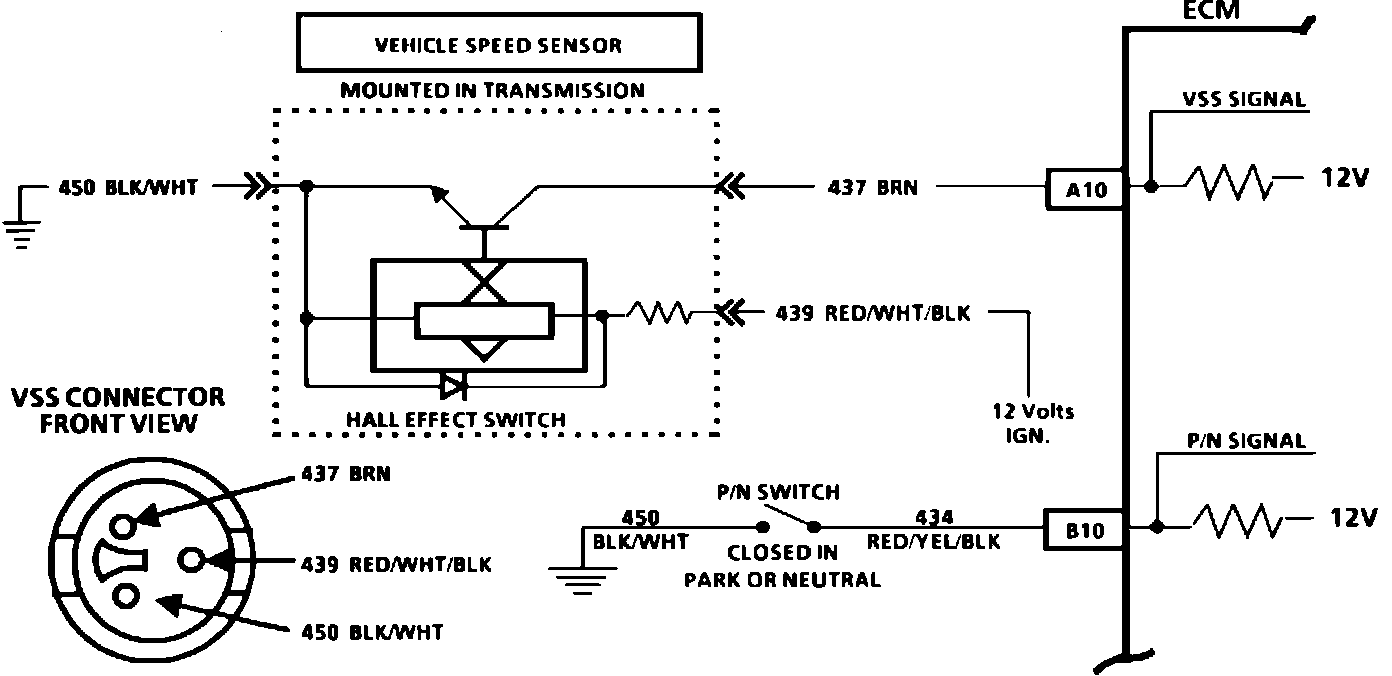 The ECM applies and monitors 12.0 volts on circuit 437. Circuit 437 connects to the Vehicle Speed Sensor (VSS), which alternately grounds circuit 437 when the drive wheels are turning. This pulsing action takes place about 3683 times per mile, and the ECM will calculate vehicle speed based on the time between pulses.